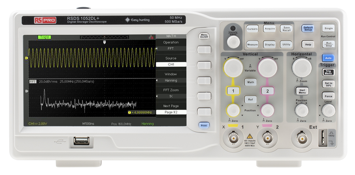 The RS Pro 123-6435 RSDS 1052 DL+ is a sophisticated 2-channel digital storage oscilloscope tailored for precise electronic testing. Featuring a 50MHz bandwidth and a vibrant 7-inch TFT LCD screen, it delivers clear waveforms for accurate signal analysis. This benchtop oscilloscope is engineered for engineers and technicians requiring reliable performance in diagnostic or educational settings. Its compact frame, combined with advanced processing, makes it a versatile tool for various laboratory applications.