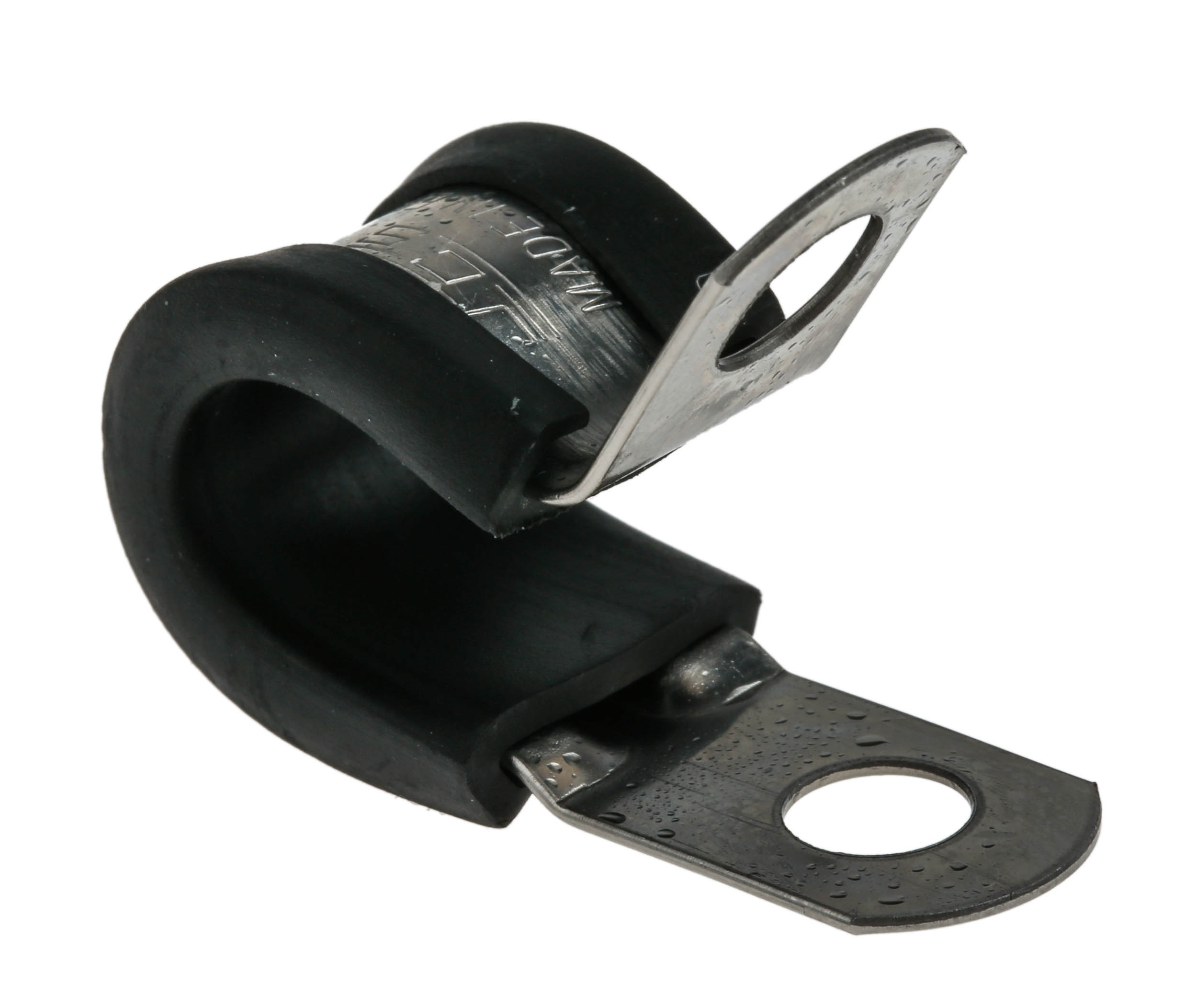 This is 8mm Black Stainless Steel P Clip manufactured by JCS. The manufacturer part number is PCSR8RS. The stainless steel is a bs304. It has a decent black colour. The product is made from highly stable and reliable stainless steel 304. The diameter of the fixing hole is 6.6mm. Furthermore, the product is 12.6mm wide. The product has about 8mm closed inside diameter . It has tpe thermoplastic coating/lining .