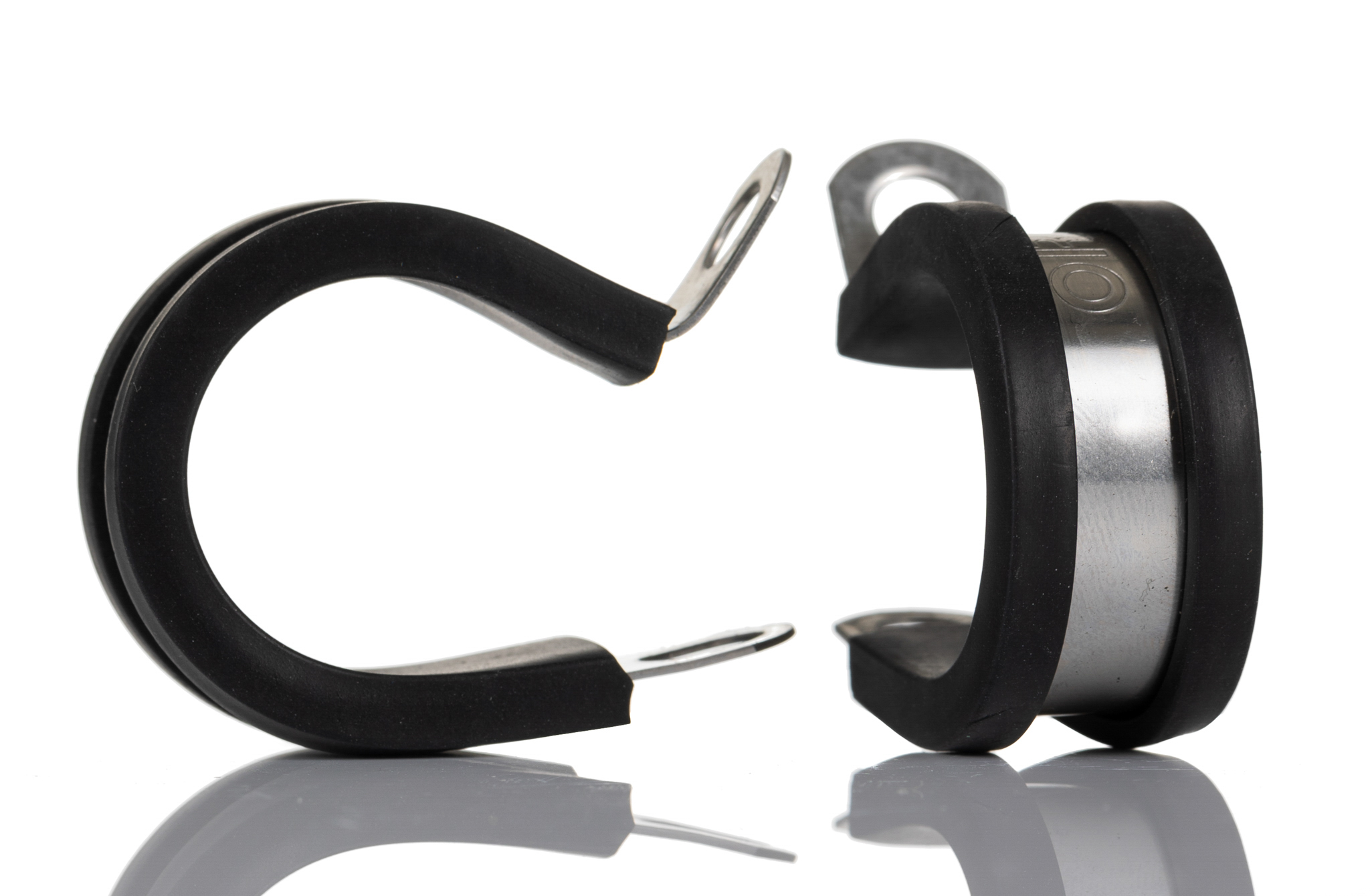 This is 28mm Black Stainless Steel 304 P Clip manufactured by RS PRO. The manufacturer part number is 253-8560. The stainless steel is a a2 304. It has a decent black colour. The product is made from highly stable and reliable stainless steel 304. The diameter of the fixing hole is 6.6mm. Furthermore, the product is 17mm wide. The product has about 28mm closed inside diameter . It has rubber coating/lining .