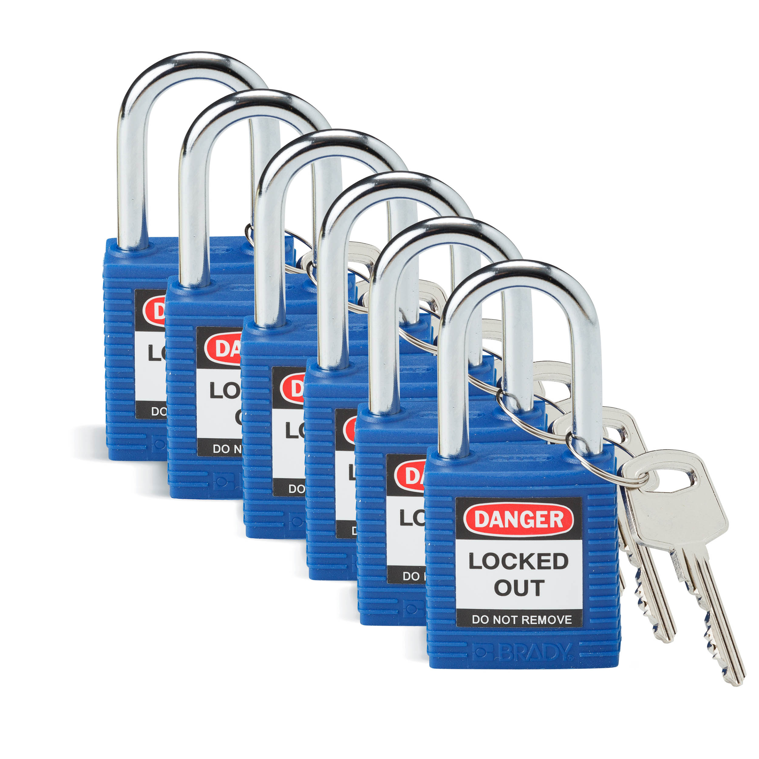 This is 38mm Nylon Steel Key Security Padlock manufactured by Brady. The manufacturer part number is 051344. Additionally, it is for indoor, outdoor . Its overall shackle diameter is approximately 6mm . It has a decent blue colour. The product is made from highly stable and reliable nylon, steel. Its shackle is about 51mm in length . It contains 6 item per package . Additionally, it has a/an key type lock . Its overall body width is 38mm . Additionally, it has a weather proof nature yes . It is keyed alike no .
