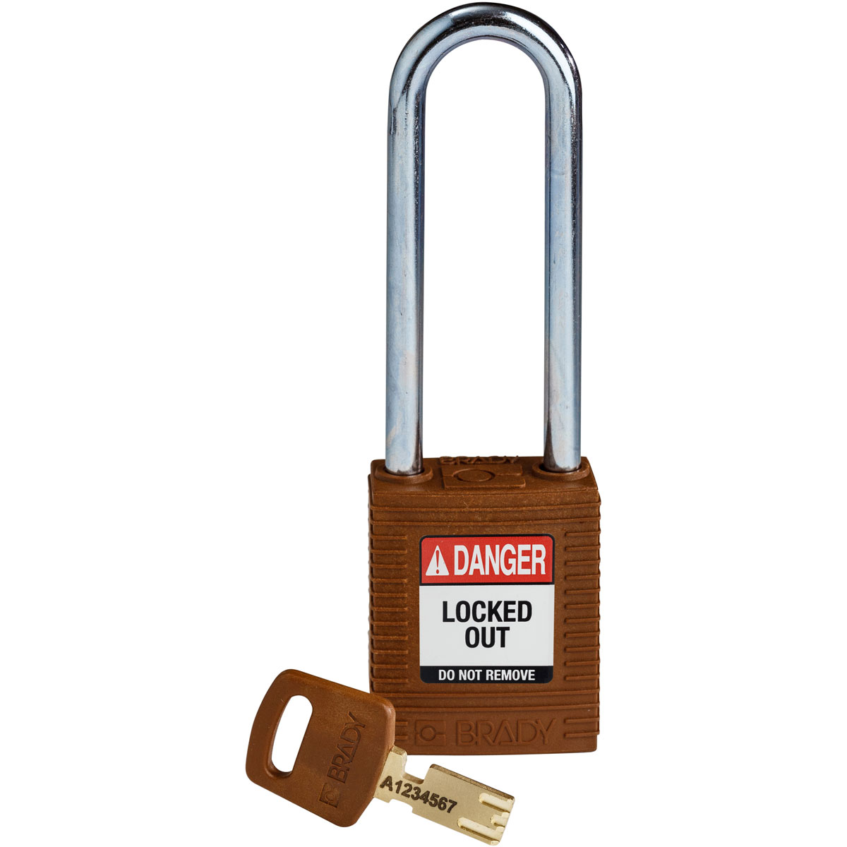 This is All Weather Nylon Padlock 38mm manufactured by Brady. The manufacturer part number is 150247. Additionally, it is for indoor, outdoor . Its overall shackle diameter is approximately 6.35mm . It has a decent brown colour. The product is made from highly stable and reliable nylon, steel. It contains 1 item per package . It has a Bluetooth feature no . Its shackle is about 76.20mm in length . It features safekey nylon range. Additionally, it has a/an key type lock . Its overall body width is 38.00mm . Additionally, it has a weather proof nature yes . It is keyed alike no .