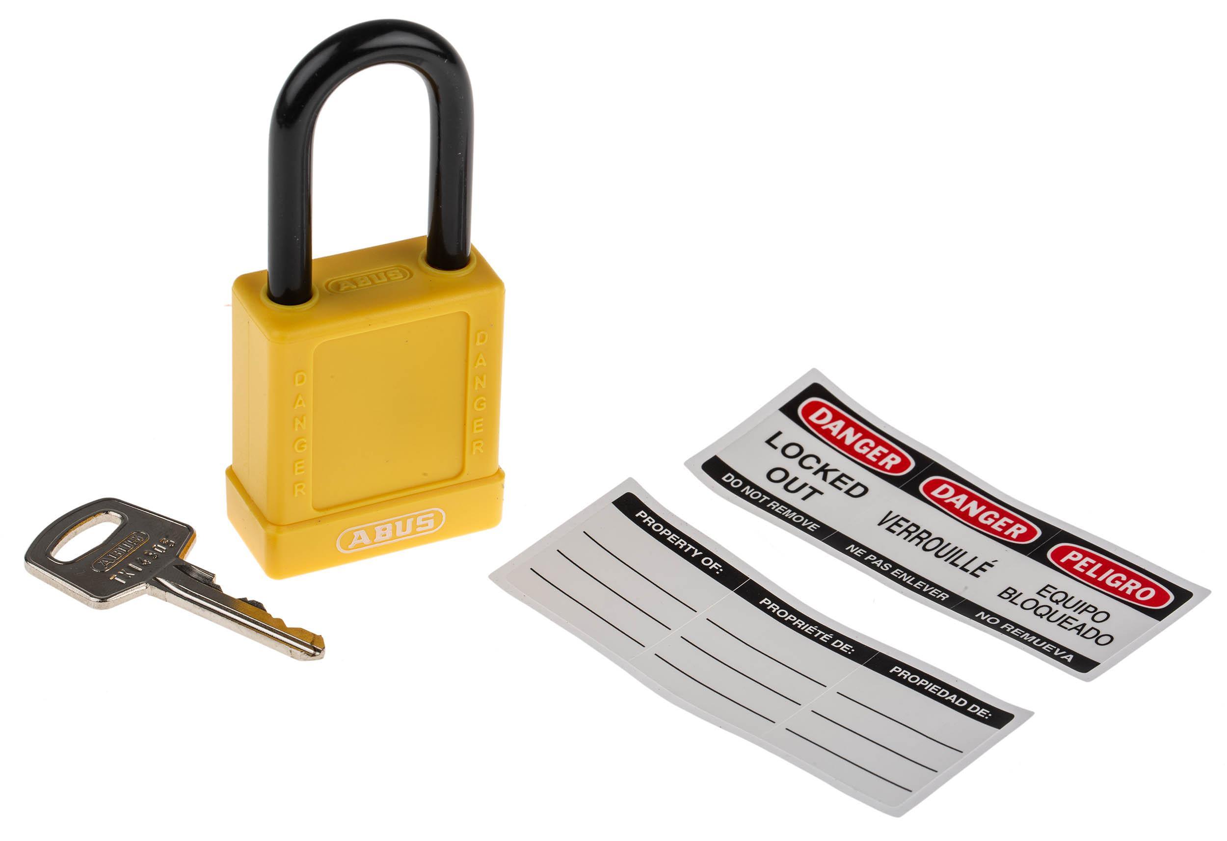 This is All Weather Aluminium Steel Safety Padlock 38mm manufactured by ABUS. The manufacturer part number is RS_805-5487. Additionally, it is for indoor, outdoor . Its overall shackle diameter is approximately 6.5mm . It has a decent yellow colour. The product is made from highly stable and reliable aluminium, steel. Its shackle is about 38mm in length . It contains 1 item per package . Additionally, it has a/an key type lock . Its overall body width is 38mm . Additionally, it has a weather proof nature yes . It is keyed alike no .