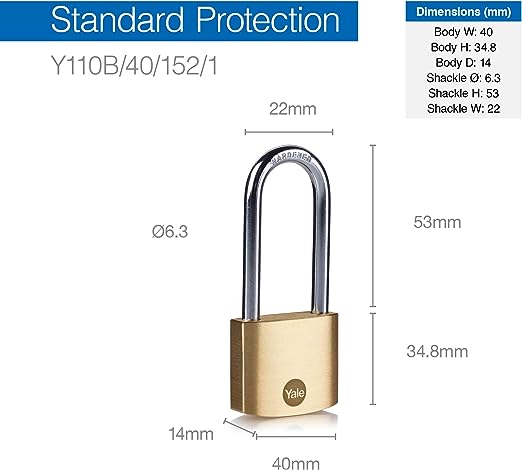This is 8888 Padlock Brass Padlock 6.3mm Shackle 40mm Body manufactured by Yale. The manufacturer part number is Y110B/40/152/1. Additionally, it is for indoor . Its overall shackle diameter is approximately 6.3mm . The product is made from highly stable and reliable brass. It has a Bluetooth feature no . Additionally, it has a/an padlock type lock . Its overall body width is 40mm . Additionally, it has a weather proof nature no . It is keyed alike no .