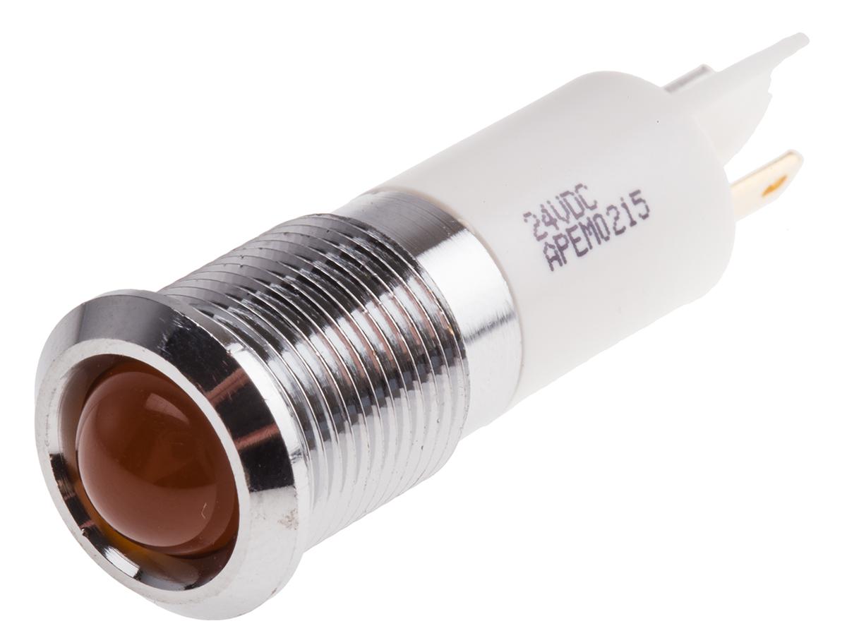 This is Orange LED Indicator 21.6 → 26.4 V dc 16 mm Lamp Size 14mm Mounting Hole Size IP67 manufactured by RS Pro. The manufacturer part number is 843-2503. Regarding light output colour, it outputs orange light colour. The product has a current rating of 20ma. In addition, It features 14mm of mounting hole size. It is IP rated with ip67. Furthermore, the bezel has a classic chrome colour. Moreover, the product has a nominal 21.6 → 26.4v dc voltage rating. The given intensity of the product is 80mcd. Its accurate length is 38.5mm. The bezel features a prominent style. It is a type of led lamp.