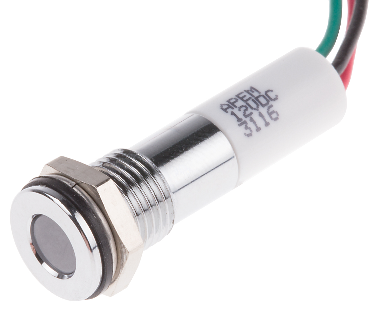 This is Flush Indicator Panel Mount 8mm Mounting Hole Size Red/Green/Yellow LED Lead Wires Termination 5 mm Lamp Size manufactured by RS Pro. The manufacturer part number is 700-1956. The product has a current rating of 20ma. In addition, It features 8mm of mounting hole size. It is IP rated with ip67. Furthermore, the bezel has a classic chrome colour. Moreover, the product has a nominal 12v dc voltage rating. Its accurate length is 27.6mm. The bezel features a flush style. The product is designed with a lead wires termination. It is a type of led lamp.