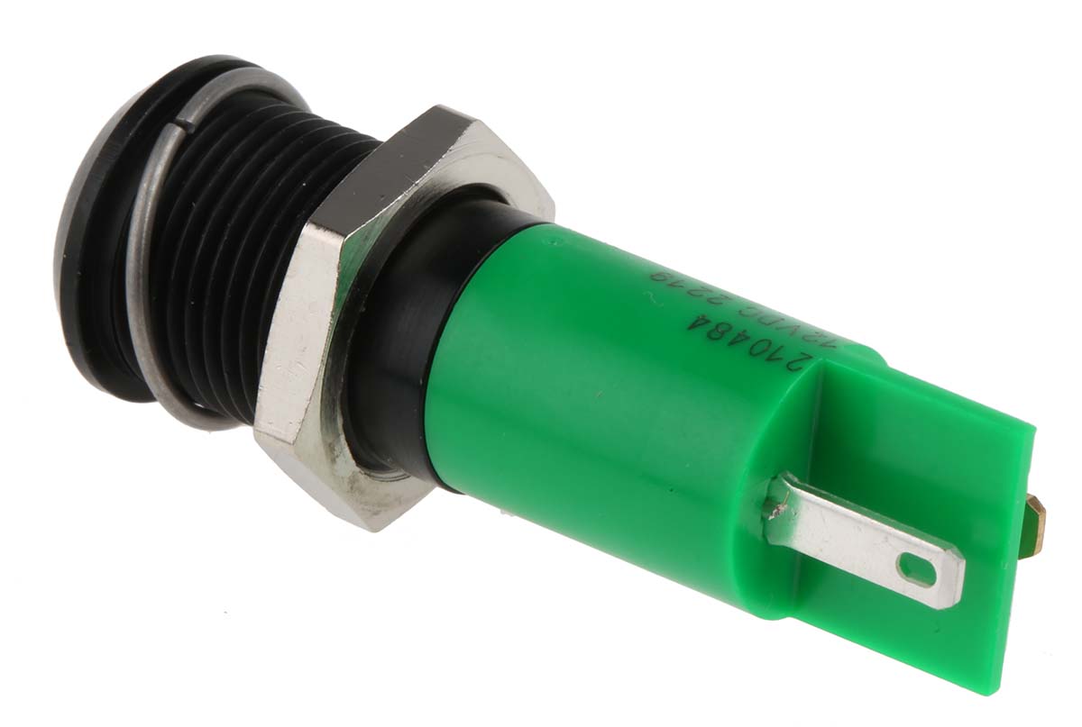 This is Green LED Indicator 12 V dc 10 mm Lamp Size 14mm Mounting Hole Size manufactured by RS Pro. The manufacturer part number is 210-484. Regarding light output colour, it outputs green light colour. The product has a current rating of 20ma. The product is designed with a solder tab termination. In addition, It features 14mm of mounting hole size. Moreover, the product has a nominal 12v dc voltage rating. Its accurate length is 47mm. The given intensity of the product is 40mcd. The bezel features a prominent style. It is a type of led lamp.