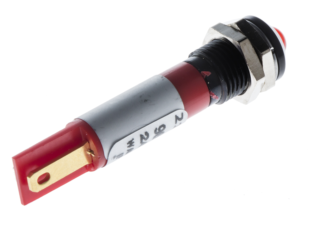 This is Red LED Indicator 24 V ac/dc 5 mm Lamp Size 8mm Mounting Hole Size IP67 manufactured by RS Pro. The manufacturer part number is 212-193. Regarding light output colour, it outputs red light colour. The product has a current rating of 17ma. In addition, It features 8mm of mounting hole size. It is IP rated with ip67. Moreover, the product has a nominal 24v dc voltage rating. The given intensity of the product is 6000mcd. Its accurate length is 44mm. The bezel features a prominent style. The product is designed with a solder tab termination. It is a type of led lamp.