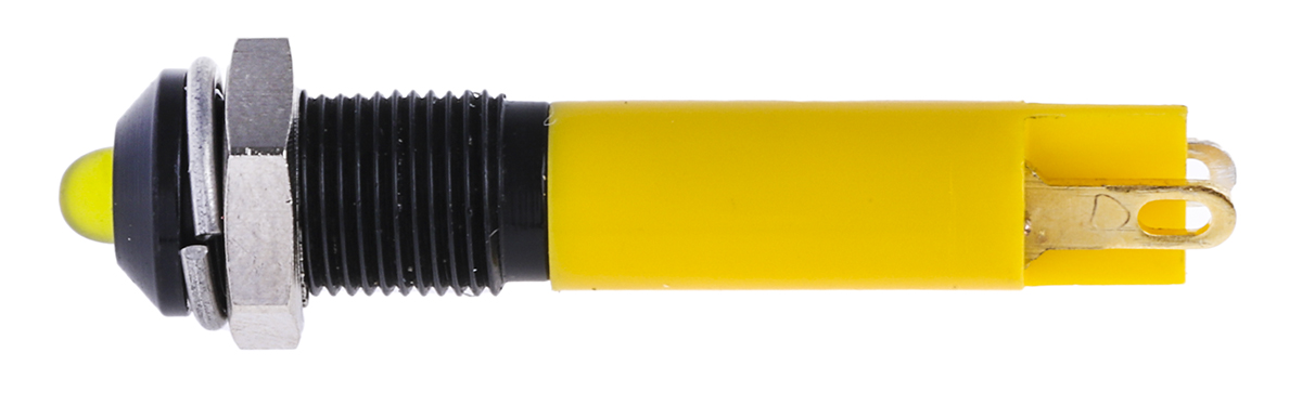 This is Yellow LED Indicator 24 V dc 3 mm Lamp Size 6mm Mounting Hole Size manufactured by RS Pro. The manufacturer part number is 210-349. Regarding light output colour, it outputs yellow light colour. Its lamp is 3 mm in size . In addition, It features 6mm of mounting hole size. The product is available in panel mount configuration. Moreover, the product has a nominal 24v dc voltage rating. Furthermore, the bezel has a classic black colour. The given intensity of the product is 30mcd. Its accurate length is 34.4mm. The bezel features a prominent style. The product is designed with a solder tab termination. The product has a current rating of 20ma. It is a type of led lamp.