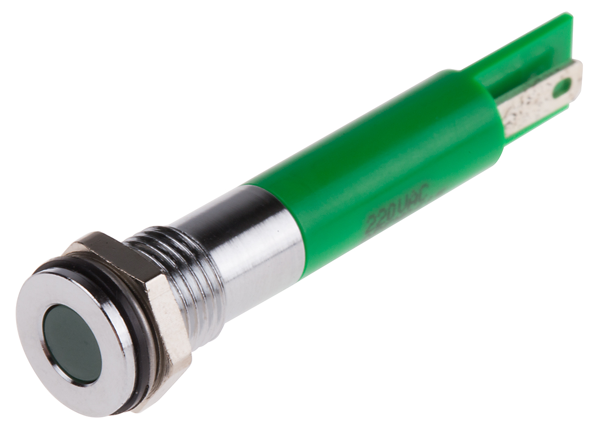 This is Green LED Indicator 220 V ac 9.5 mm Lamp Size 8mm Mounting Hole Size IP67 manufactured by RS Pro. The manufacturer part number is 846-2904. Regarding light output colour, it outputs green light colour. The product has a current rating of 3ma. In addition, It features 8mm of mounting hole size. It is IP rated with ip67. Furthermore, the bezel has a classic chrome colour. Moreover, the product has a nominal 220v ac voltage rating. Its accurate length is 34.9mm. The given intensity of the product is 300mcd. The bezel features a flush style. It is a type of led lamp.