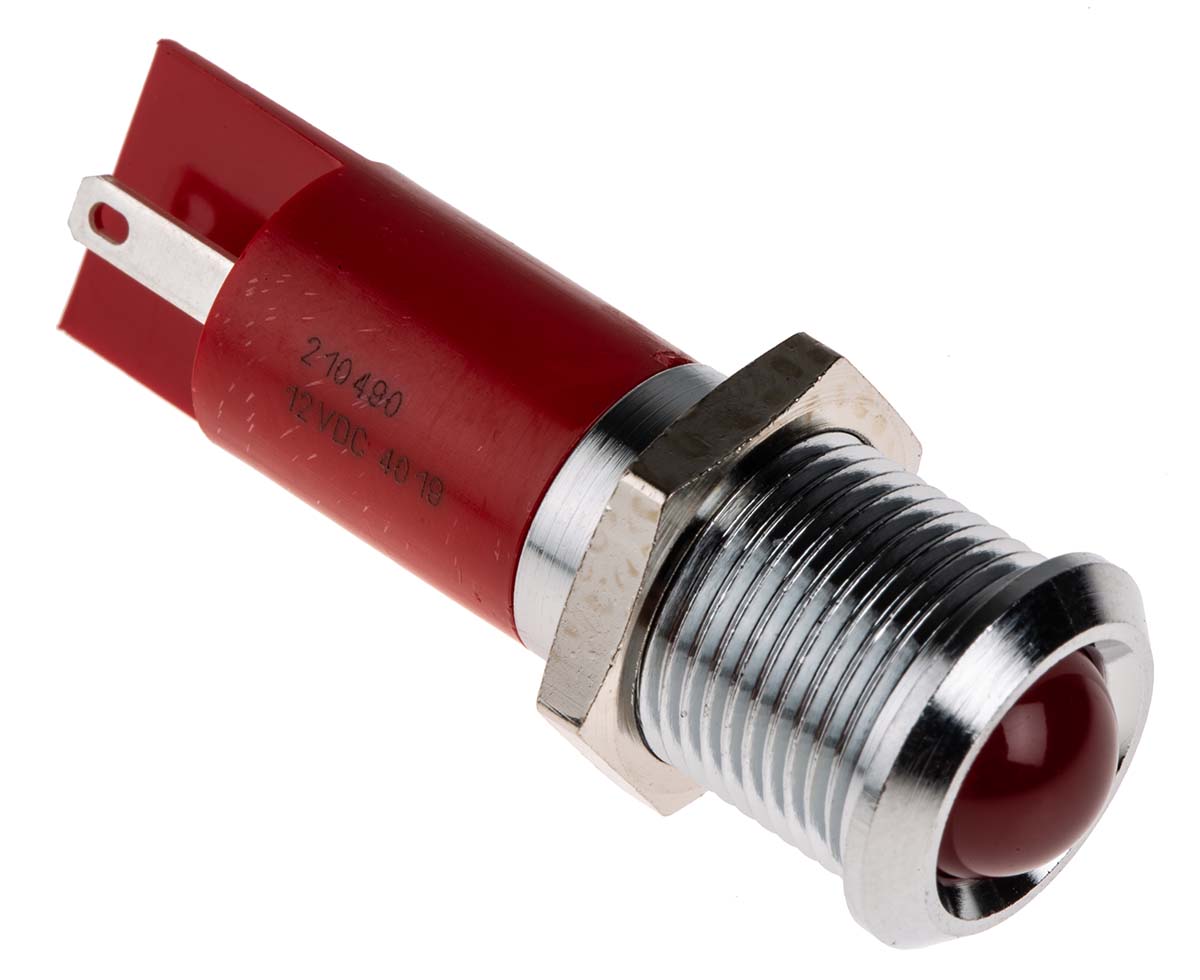 This is Red LED Indicator 12 V dc 10 mm Lamp Size 14mm Mounting Hole Size manufactured by RS Pro. The manufacturer part number is 210-490. Regarding light output colour, it outputs red light colour. The product has a current rating of 20ma. The product is designed with a solder tab termination. In addition, It features 14mm of mounting hole size. Moreover, the product has a nominal 12v dc voltage rating. Furthermore, the bezel has a classic chrome colour. Its accurate length is 47mm. The given intensity of the product is 80mcd. The bezel features a prominent style. It is a type of led lamp.
