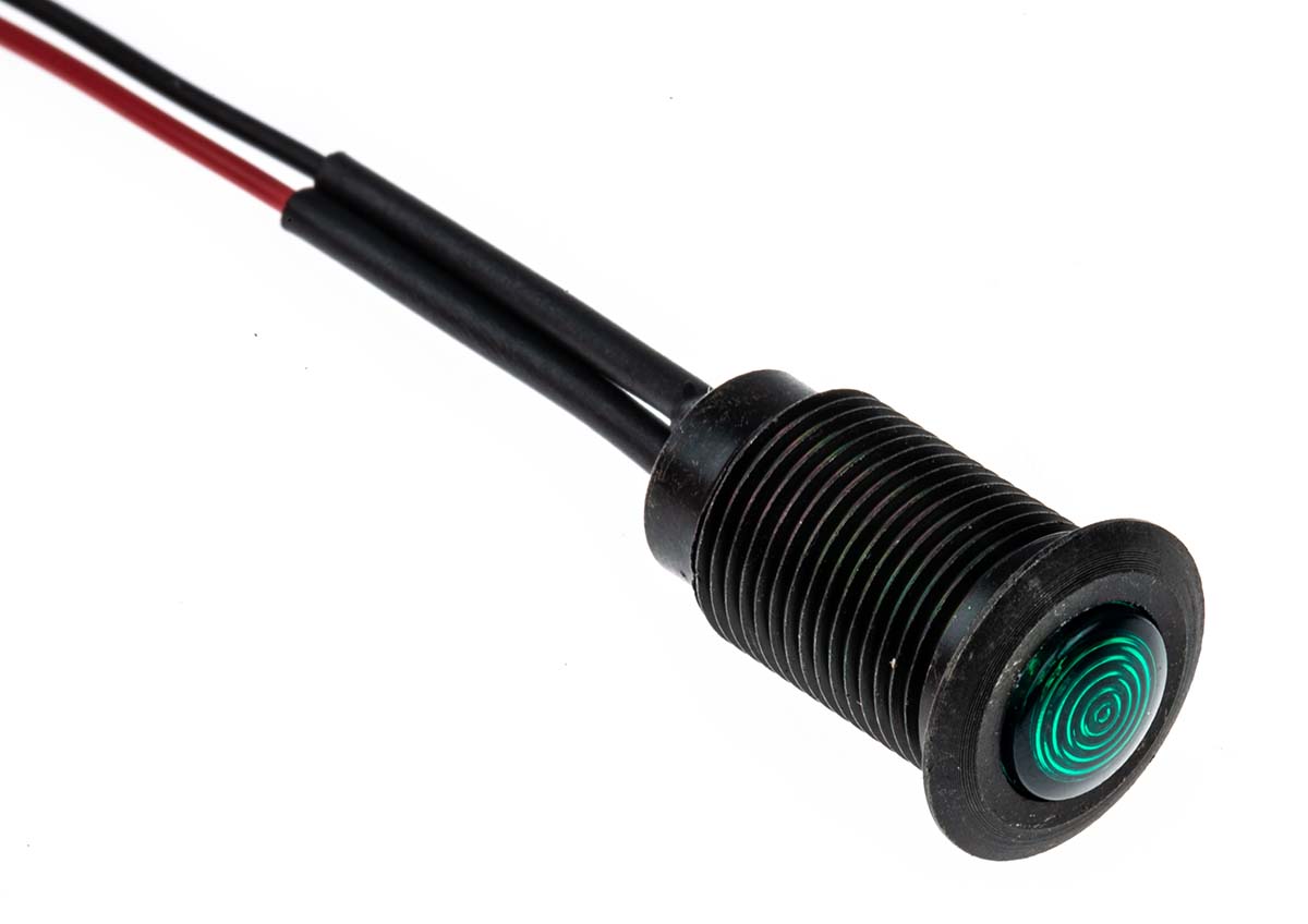 This is Flush Indicator Panel Mount 10.15mm Mounting Hole Size Green LED Lead Wires Termination 7.1 mm Lamp Size 230 V ac manufactured by Oxley. The manufacturer part number is OXL/CLH/100/230/FL30/GN. Regarding light output colour, it outputs green light colour. The product has a current rating of 2.5ma. In addition, It features 10.2mm of mounting hole size. It is IP rated with ip66. Furthermore, the bezel has a classic black colour. Moreover, the product has a nominal 230v ac voltage rating. The given intensity of the product is 160mcd. Its accurate length is 18.7mm. The bezel features a flush style. The product is designed with a lead wires termination. It is a type of led lamp.