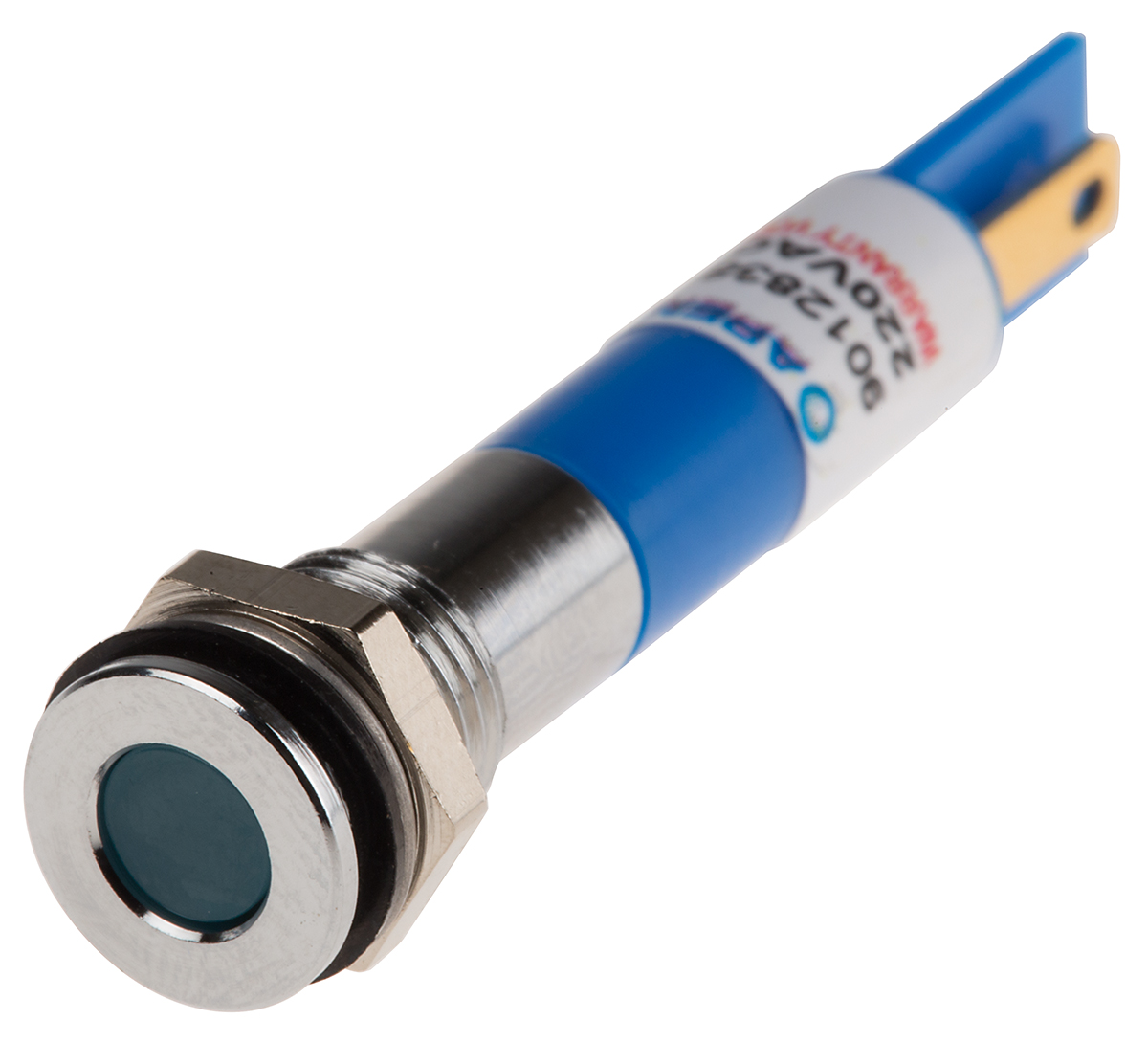 This is Blue LED Indicator 220 V ac 9.5 mm Lamp Size 8mm Mounting Hole Size IP67 manufactured by RS Pro. The manufacturer part number is 846-2917. Regarding light output colour, it outputs blue light colour. The product has a current rating of 3ma. In addition, It features 8mm of mounting hole size. It is IP rated with ip67. Furthermore, the bezel has a classic chrome colour. Moreover, the product has a nominal 220v ac voltage rating. The given intensity of the product is 50mcd. Its accurate length is 34.9mm. The bezel features a flush style. It is a type of led lamp.