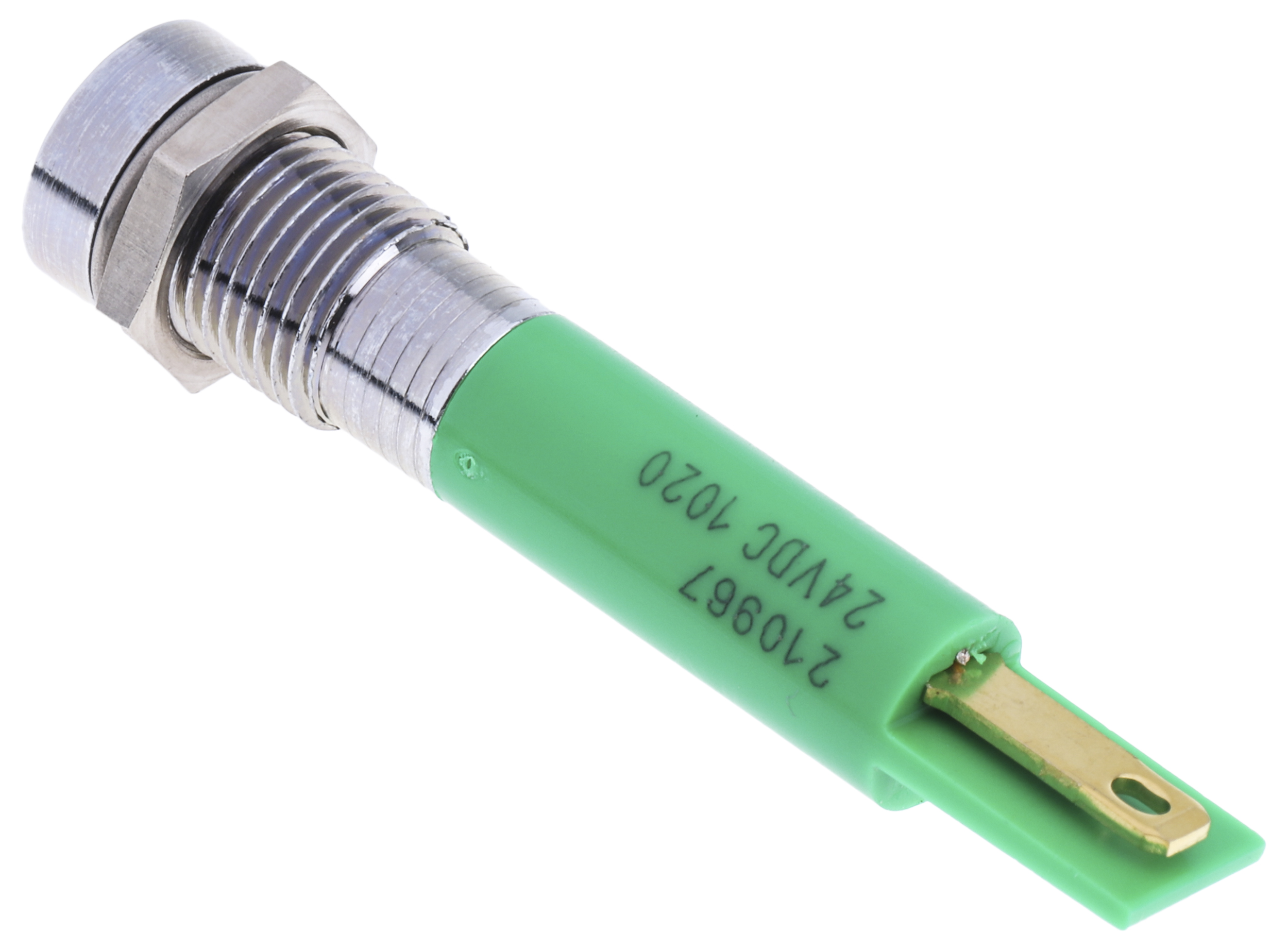 This is Green LED Indicator 24 V dc 5 mm Lamp Size 8mm Mounting Hole Size IP40 manufactured by RS Pro. The manufacturer part number is 210-967. Regarding light output colour, it outputs green light colour. The product has a current rating of 20ma. The product is designed with a solder tab termination. In addition, It features 8mm of mounting hole size. It is IP rated with ip40. Furthermore, the bezel has a classic chrome colour. Moreover, the product has a nominal 24v dc voltage rating. Its accurate length is 37mm. The given intensity of the product is 40mcd. The bezel features a recessed style. It is a type of led lamp.