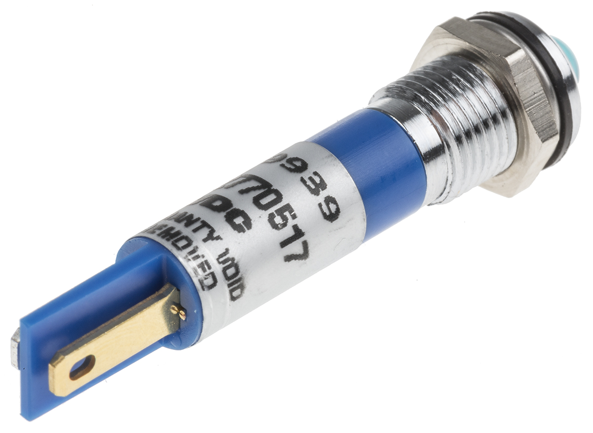 This is Prominent Indicator Panel Mount 8mm Mounting Hole Size Blue LED Solder Tab Termination 5 mm Lamp Size 24 V dc manufactured by RS Pro. The manufacturer part number is 209-939. Regarding light output colour, it outputs blue light colour. The product has a current rating of 20ma. In addition, It features 8mm of mounting hole size. Moreover, the product has a nominal 24v dc voltage rating. Furthermore, the bezel has a classic chrome colour. The given intensity of the product is 90mcd. Its accurate length is 33.9mm. The bezel features a prominent style. The product is designed with a solder tab termination. It is a type of led lamp.