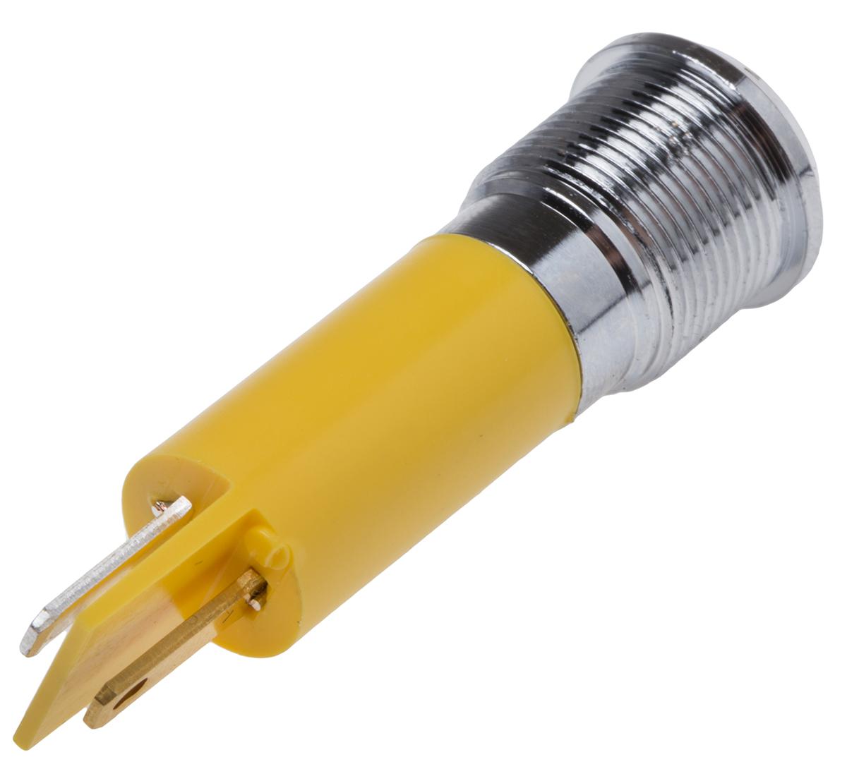 This is Yellow LED Indicator 12 V 8 mm Lamp Size 12mm Mounting Hole Size IP67 manufactured by RS Pro. The manufacturer part number is 208-649. Regarding light output colour, it outputs yellow light colour. The product has a current rating of 20ma. In addition, It features 12mm of mounting hole size. It is IP rated with ip67. Furthermore, the bezel has a classic chrome colour. The given intensity of the product is 50mcd. Its accurate length is 56mm. The bezel features a prominent style. The product is designed with a solder tab termination. It is a type of led lamp.