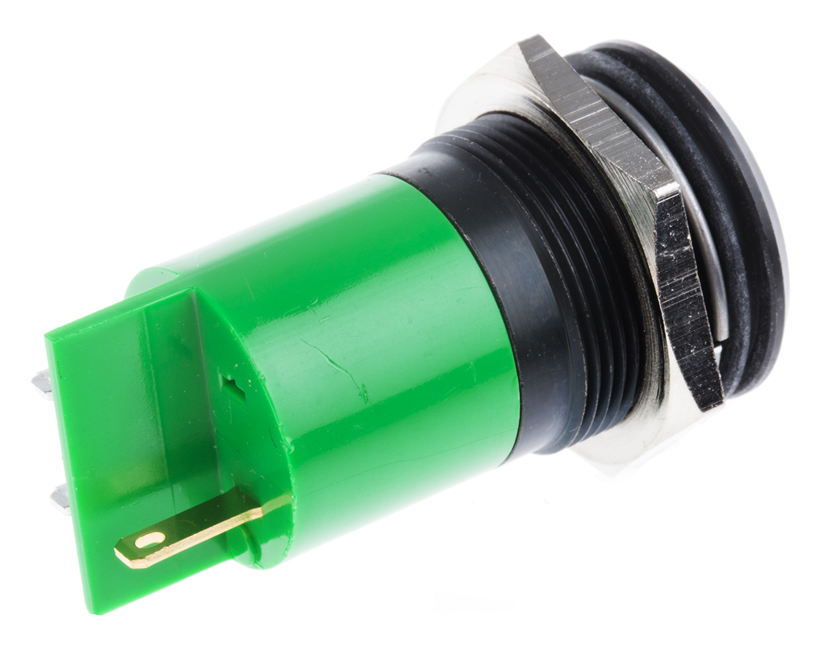 This is Green LED Indicator 24 V dc 18 mm Lamp Size 22mm Mounting Hole Size manufactured by RS Pro. The manufacturer part number is 207-905. Regarding light output colour, it outputs green light colour. The product has a current rating of 20ma. In addition, It features 22mm of mounting hole size. Moreover, the product has a nominal 24v dc voltage rating. The given intensity of the product is 95mcd. Its accurate length is 61mm. The bezel features a prominent style. The product is designed with a solder tab termination. It is a type of led lamp.