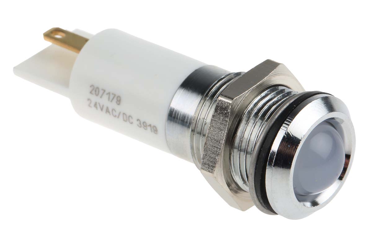 This is White LED Indicator 24 V ac/dc 10 mm Lamp Size 14mm Mounting Hole Size IP67 manufactured by RS Pro. The manufacturer part number is 207-179. Regarding light output colour, it outputs white light colour. The product has a current rating of 16 → 20ma. In addition, It features 14mm of mounting hole size. It is IP rated with ip67. Furthermore, the bezel has a classic chrome colour. The given intensity of the product is 1000mcd. Its accurate length is 47mm. The bezel features a prominent style. It is a type of led lamp.