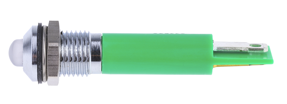 This is Green LED Indicator 24 V ac/dc 5 mm Lamp Size 8mm Mounting Hole Size IP67 manufactured by RS Pro. The manufacturer part number is 211-522. Regarding light output colour, it outputs green light colour. The product has a current rating of 20ma. In addition, It features 8mm of mounting hole size. It is IP rated with ip67. Furthermore, the bezel has a classic chrome colour. Moreover, the product has a nominal 24v ac/dc voltage rating. The given intensity of the product is 40mcd. Its accurate length is 44mm. The bezel features a prominent style. The product is designed with a solder tab termination. It is a type of led lamp.