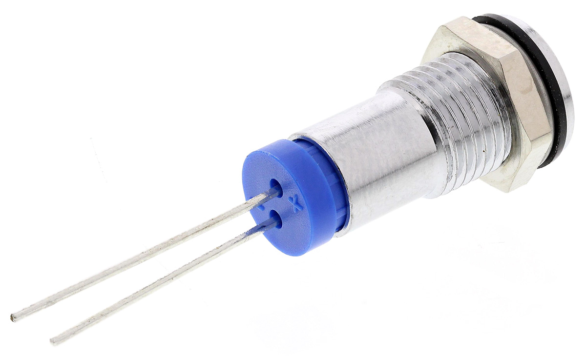 This is Flush Indicator Panel Mount 8mm Mounting Hole Size Blue LED Lead Pins Termination 5 mm Lamp Size 2 V dc manufactured by RS Pro. The manufacturer part number is 700-1659. Regarding light output colour, it outputs blue light colour. The product has a current rating of 20ma. In addition, It features 8mm of mounting hole size. It is IP rated with ip67. Furthermore, the bezel has a classic chrome colour. Moreover, the product has a nominal 2v dc voltage rating. The given intensity of the product is 4mcd. Its accurate length is 17.6mm. The bezel features a flush style. It is a type of led lamp.