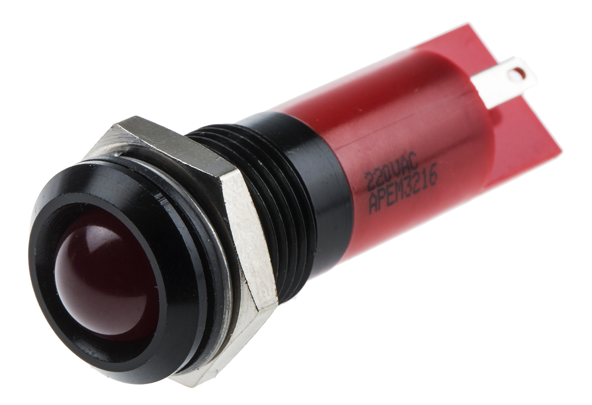 This is Prominent Indicator Panel Mount 14mm Mounting Hole Size Red LED Faston Solder Lug Termination 10 mm Lamp Size manufactured by RS Pro. The manufacturer part number is 848-4617. Regarding light output colour, it outputs red light colour. The product has a current rating of 3ma. The product is designed with a faston, solder lug termination. In addition, It features 14mm of mounting hole size. It is IP rated with ip67. Moreover, the product has a nominal 220v ac voltage rating. Its accurate length is 38.5mm. The given intensity of the product is 7500mcd. The bezel features a prominent style. It is a type of led lamp.