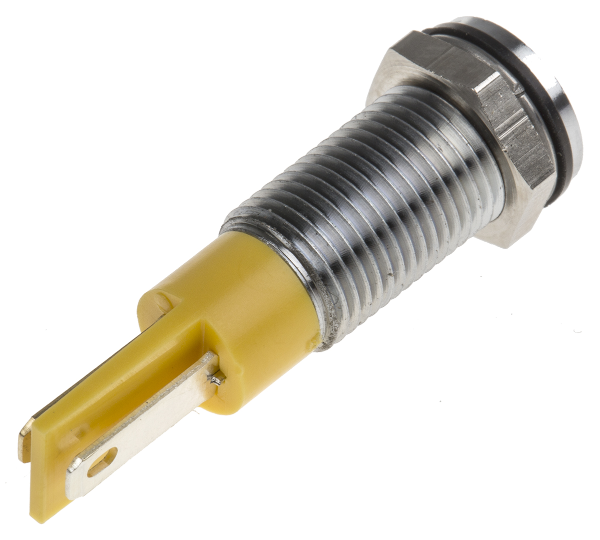 This is Yellow LED Indicator 12 V dc 5 mm Lamp Size 8mm Mounting Hole Size IP67 manufactured by RS Pro. The manufacturer part number is 913-2698. Regarding light output colour, it outputs yellow light colour. The product has a current rating of 20ma. In addition, It features 8mm of mounting hole size. It is IP rated with ip67. Furthermore, the bezel has a classic chrome colour. Moreover, the product has a nominal 12v dc voltage rating. The given intensity of the product is 250mcd. Its accurate length is 21.6mm. The bezel features a flush style. The product is designed with a faston, solder lug termination. It is a type of led lamp.