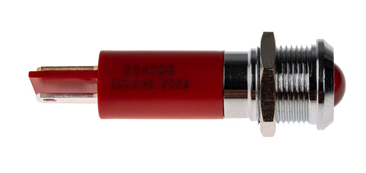 This is Red LED Indicator 230 V ac 8 mm Lamp Size 12mm Mounting Hole Size IP67 manufactured by RS Pro. The manufacturer part number is 204-338. Regarding light output colour, it outputs red light colour. The product has a current rating of 3ma. In addition, It features 12mm of mounting hole size. It is IP rated with ip67. Furthermore, the bezel has a classic chrome colour. Moreover, the product has a nominal 230v ac voltage rating. The given intensity of the product is 70mcd. Its accurate length is 45.3mm. The bezel features a prominent style. It is a type of led lamp.