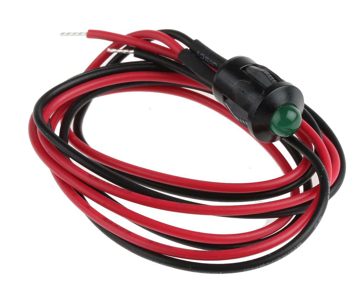 This is Green LED Indicator 24 V dc 5 mm Lamp Size 8mm Mounting Hole Size manufactured by RS Pro. The manufacturer part number is 206-867. Regarding light output colour, it outputs green light colour. The product has a current rating of 20ma. In addition, It features 8mm of mounting hole size. Moreover, the product has a nominal 24v dc voltage rating. Furthermore, the bezel has a classic black colour. The given intensity of the product is 40mcd. Its accurate length is 14.5mm. The bezel features a prominent style. The product is designed with a lead wires termination. It is a type of led lamp.