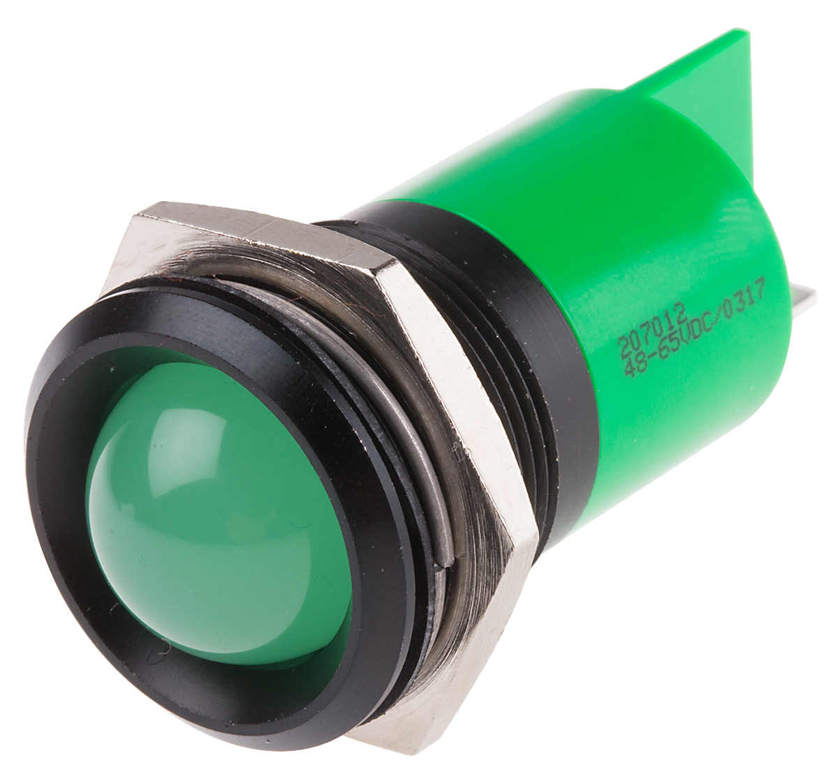 This is Green LED Indicator 48 → 65 V dc 16 mm Lamp Size 22mm Mounting Hole Size manufactured by RS Pro. The manufacturer part number is 207-012. Regarding light output colour, it outputs green light colour. The product has a current rating of 10ma. In addition, It features 22mm of mounting hole size. Moreover, the product has a nominal 48 → 65v dc voltage rating. Its accurate length is 61mm. The bezel features a prominent style. It is a type of led lamp.