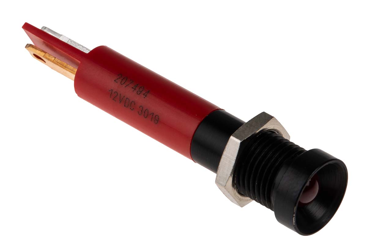 This is Red LED Indicator 12 V dc 5 mm Lamp Size 8mm Mounting Hole Size manufactured by RS Pro. The manufacturer part number is 207-494. Regarding light output colour, it outputs red light colour. The product has a current rating of 20ma. In addition, It features 8mm of mounting hole size. Moreover, the product has a nominal 12v dc voltage rating. The given intensity of the product is 5000mcd. Its accurate length is 34.8mm. The bezel features a recessed style. The product is designed with a solder tab termination. It is a type of led lamp.