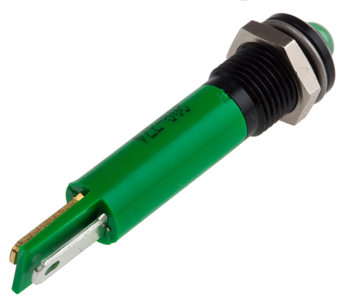 This is Green LED Indicator 24 V ac 5 mm Lamp Size 8mm Mounting Hole Size manufactured by RS Pro. The manufacturer part number is 208-374. Regarding light output colour, it outputs green light colour. The product has a current rating of 20ma. In addition, It features 8mm of mounting hole size. Moreover, the product has a nominal 24v ac voltage rating. The given intensity of the product is 40mcd. Its accurate length is 40mm. The bezel features a prominent style. The product is designed with a solder tab termination. It is a type of led lamp.
