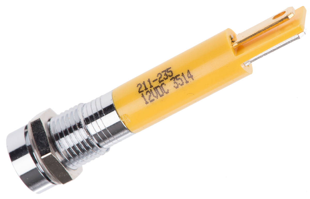 This is Recessed Indicator Panel Mount 8mm Mounting Hole Size Yellow LED Solder Tab Termination 5 mm Lamp Size 12 V dc manufactured by RS Pro. The manufacturer part number is 211-235. Regarding light output colour, it outputs yellow light colour. The product has a current rating of 20ma. The product is designed with a solder tab termination. In addition, It features 8mm of mounting hole size. Moreover, the product has a nominal 12v dc voltage rating. Furthermore, the bezel has a classic chrome colour. Its accurate length is 34.8mm. The given intensity of the product is 40mcd. The bezel features a recessed style. It is a type of led lamp.