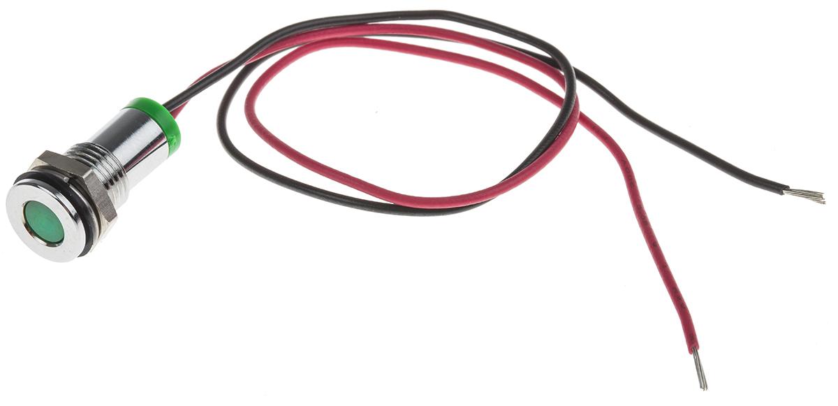 This is Flush Indicator Panel Mount 8mm Mounting Hole Size Green LED Lead Wires Termination 5 mm Lamp Size 2 V dc manufactured by RS Pro. The manufacturer part number is 700-1895. Regarding light output colour, it outputs green light colour. The product has a current rating of 20ma. In addition, It features 8mm of mounting hole size. It is IP rated with ip67. Furthermore, the bezel has a classic chrome colour. Moreover, the product has a nominal 2v dc voltage rating. The given intensity of the product is 6mcd. Its accurate length is 17.6mm. The bezel features a flush style. The product is designed with a lead wires termination. It is a type of led lamp.