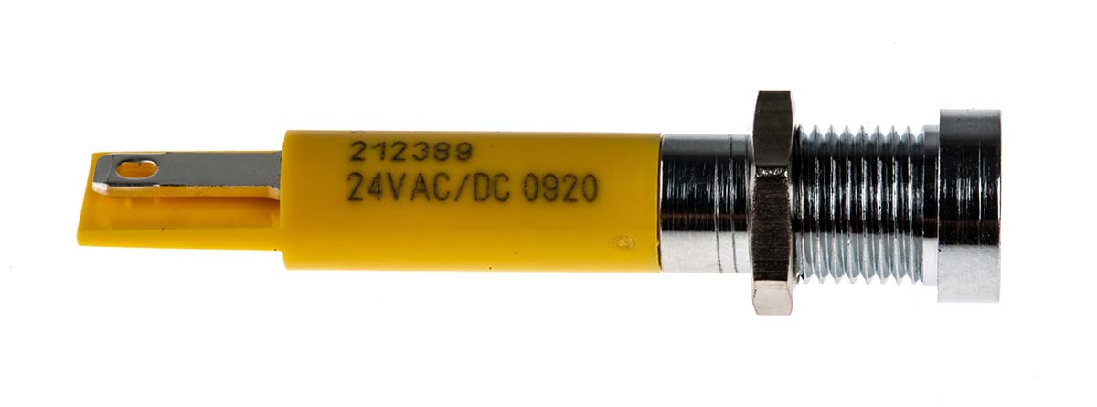 This is Recessed Indicator Panel Mount 8mm Mounting Hole Size Yellow LED Solder Tab Termination 5 mm Lamp Size 24 V dc manufactured by RS Pro. The manufacturer part number is 210-989. Regarding light output colour, it outputs yellow light colour. The product has a current rating of 20ma. The product is designed with a solder tab termination. In addition, It features 8mm of mounting hole size. Moreover, the product has a nominal 24v dc voltage rating. Furthermore, the bezel has a classic chrome colour. Its accurate length is 34.8mm. The given intensity of the product is 40mcd. The bezel features a recessed style. It is a type of led lamp.
