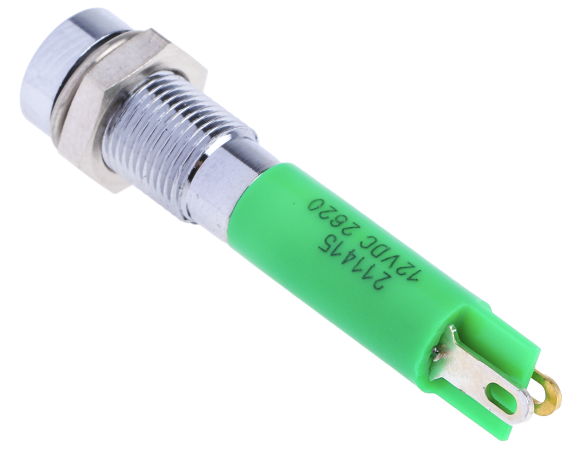 This is Recessed Indicator Panel Mount 6mm Mounting Hole Size Green LED Solder Tab Termination 3 mm Lamp Size 12 V dc manufactured by RS Pro. The manufacturer part number is 211-415. Regarding light output colour, it outputs green light colour. Its lamp is 3 mm in size . The product is designed with a solder tab termination. The product is available in panel mount configuration. Moreover, the product has a nominal 12v dc voltage rating. Furthermore, the bezel has a classic chrome colour. In addition, It features 6mm of mounting hole size. The given intensity of the product is 40mcd. Its accurate length is 34.4mm. The bezel features a recessed style. The product has a current rating of 20ma. It is a type of led lamp.