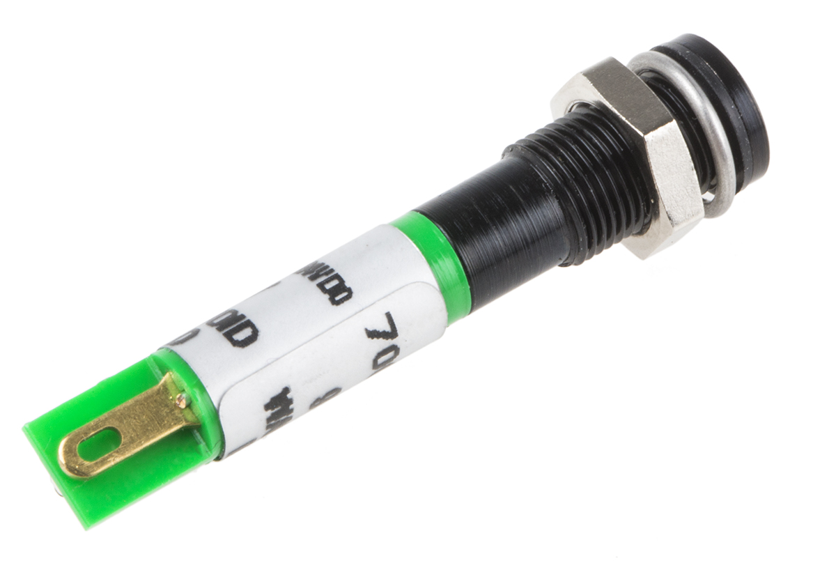 This is Green LED Indicator 24 V dc 3 mm Lamp Size 6mm Mounting Hole Size IP67 manufactured by RS Pro. The manufacturer part number is 700-1634. Regarding light output colour, it outputs green light colour. Its lamp is 3 mm in size . In addition, It features 6mm of mounting hole size. It is IP rated with ip67. Moreover, the product has a nominal 24v dc voltage rating. The given intensity of the product is 8mcd. Its accurate length is 27mm. The bezel features a flush style. The product is designed with a solder tab termination. The product has a current rating of 20ma. It is a type of led lamp.