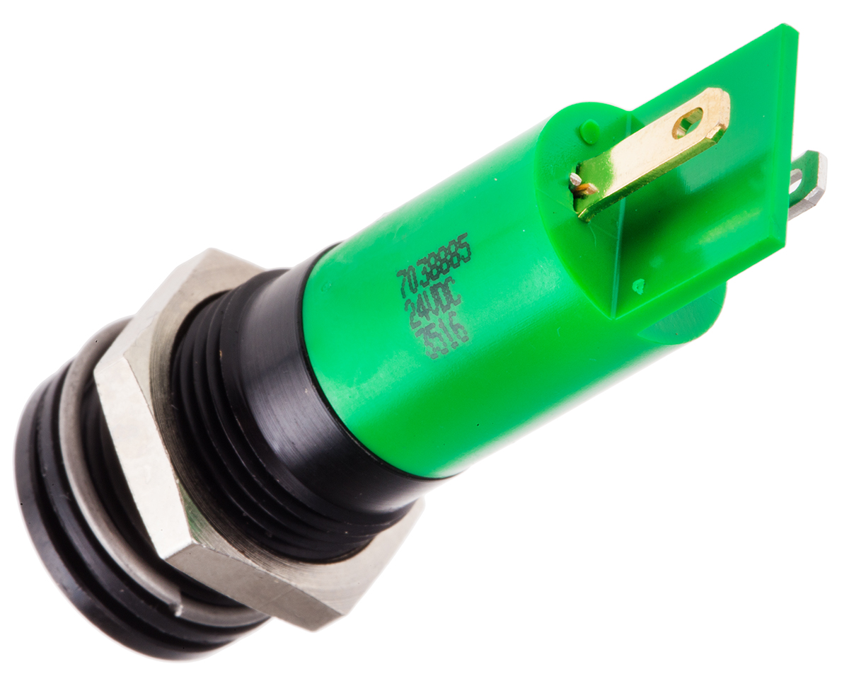 This is Green LED Indicator 24 V dc 10 mm Lamp Size 14mm Mounting Hole Size IP67 manufactured by RS Pro. The manufacturer part number is 703-8885. Regarding light output colour, it outputs green light colour. The product has a current rating of 20ma. The product is designed with a solder tab termination. In addition, It features 14mm of mounting hole size. It is IP rated with ip67. Moreover, the product has a nominal 24v dc voltage rating. Its accurate length is 35.6mm. The given intensity of the product is 5mcd. The bezel features a flush style. It is a type of led lamp.
