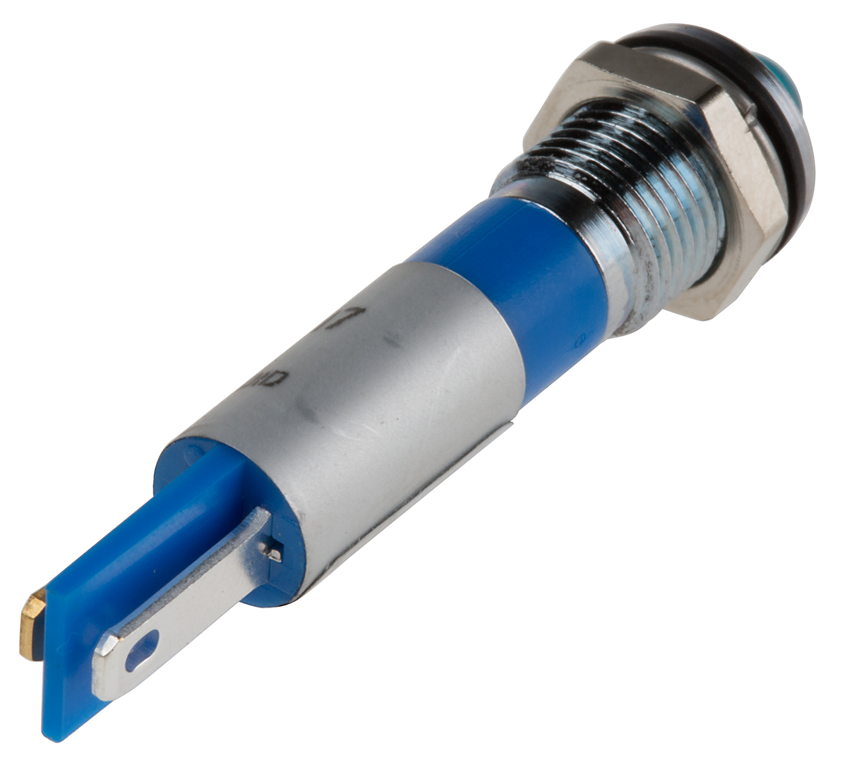 This is Prominent Indicator Panel Mount 8mm Mounting Hole Size Blue LED Faston Solder Lug Termination 5 mm Lamp Size manufactured by RS Pro. The manufacturer part number is 838-5532. Regarding light output colour, it outputs blue light colour. The product has a current rating of 20ma. In addition, It features 8mm of mounting hole size. It is IP rated with ip67. Furthermore, the bezel has a classic chrome colour. Moreover, the product has a nominal 12v dc voltage rating. The given intensity of the product is 90mcd. Its accurate length is 28.8mm. The bezel features a prominent style. The product is designed with a faston, solder lug termination. It is a type of led lamp.