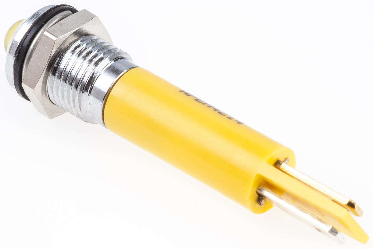 This is Yellow LED Indicator 110 V ac 8.5 mm Lamp Size 8mm Mounting Hole Size IP67 manufactured by RS Pro. The manufacturer part number is 846-2706. Regarding light output colour, it outputs yellow light colour. The product has a current rating of 6ma. In addition, It features 8mm of mounting hole size. It is IP rated with ip67. Furthermore, the bezel has a classic chrome colour. Moreover, the product has a nominal 110v ac voltage rating. Its accurate length is 28.9mm. The given intensity of the product is 1600mcd. The bezel features a prominent style. It is a type of led lamp.