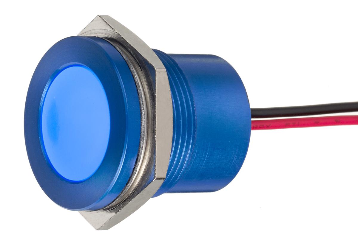 This is Flush Indicator Panel Mount 22mm Mounting Hole Size Blue LED Lead Wires Termination 18 mm Lamp Size 28 V ac/dc manufactured by RS Pro. The manufacturer part number is 898-7807. Regarding light output colour, it outputs blue light colour. The product has a current rating of 40ma. In addition, It features 22mm of mounting hole size. It is IP rated with ip67. Furthermore, the bezel has a classic blue colour. Moreover, the product has a nominal 28v voltage rating. The given intensity of the product is 100mcd. Its accurate length is 24.5mm. The bezel features a flush style. The product is designed with a lead wires termination. It is a type of led lamp.