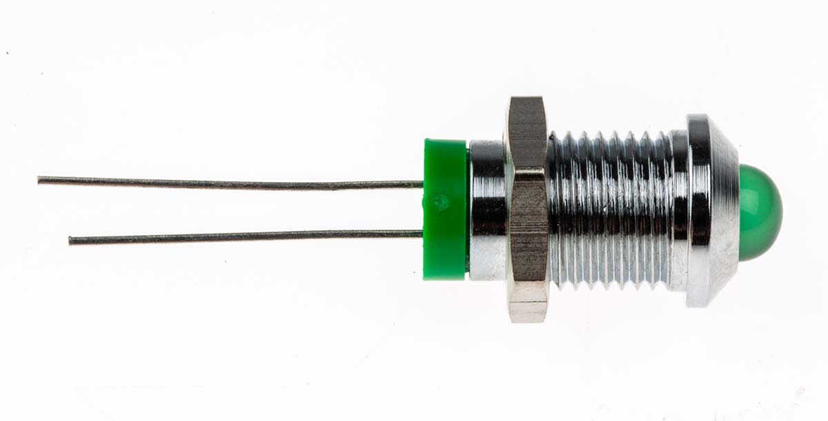 This is Prominent Indicator Panel Mount 8mm Mounting Hole Size Green LED Lead Pins Termination 5 mm Lamp Size 2 V dc manufactured by RS Pro. The manufacturer part number is 205-555. Regarding light output colour, it outputs green light colour. The product has a current rating of 20ma. In addition, It features 8mm of mounting hole size. It is IP rated with ip67. Furthermore, the bezel has a classic chrome colour. Moreover, the product has a nominal 2v dc voltage rating. The given intensity of the product is 40mcd. Its accurate length is 30.5mm. The bezel features a prominent style. It is a type of led lamp.