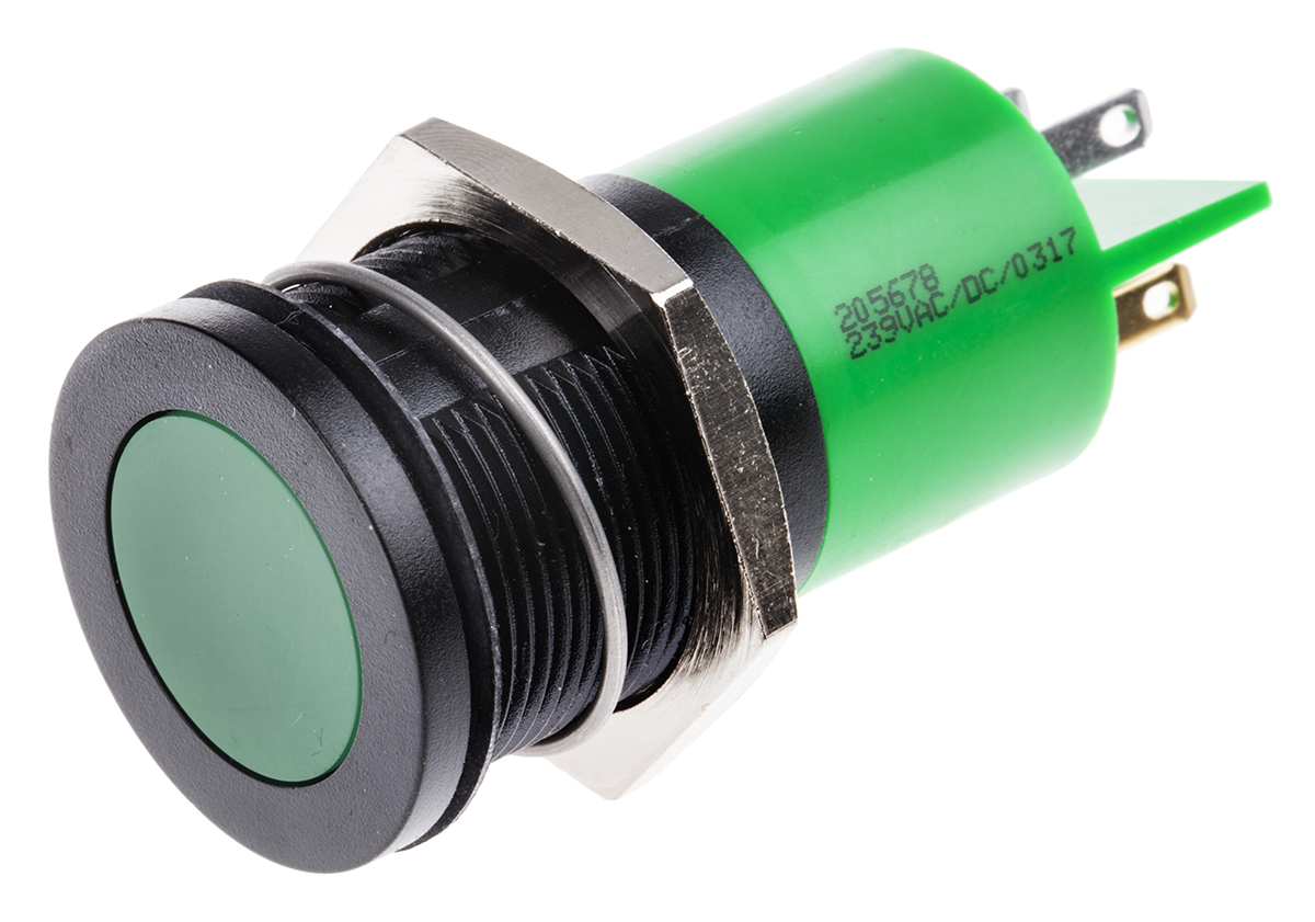 This is Green LED Indicator 230 V ac 16 mm Lamp Size 22mm Mounting Hole Size IP67 manufactured by RS Pro. The manufacturer part number is 205-678. Regarding light output colour, it outputs green light colour. The product has a current rating of 3ma. In addition, It features 22mm of mounting hole size. It is IP rated with ip67. Furthermore, the bezel has a classic black colour. Moreover, the product has a nominal 230v ac voltage rating. The given intensity of the product is 66mcd. Its accurate length is 64mm. The bezel features a flush style. It is a type of led lamp.