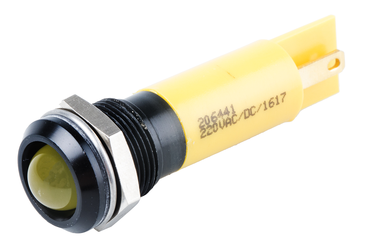 This is Yellow LED Indicator 230 V ac 8 mm Lamp Size 12mm Mounting Hole Size IP67 manufactured by RS Pro. The manufacturer part number is 206-441. Regarding light output colour, it outputs yellow light colour. The product has a current rating of 3ma. In addition, It features 12mm of mounting hole size. It is IP rated with ip67. Furthermore, the bezel has a classic black colour. Moreover, the product has a nominal 230v ac voltage rating. The given intensity of the product is 60mcd. Its accurate length is 56mm. The bezel features a prominent style. It is a type of led lamp.