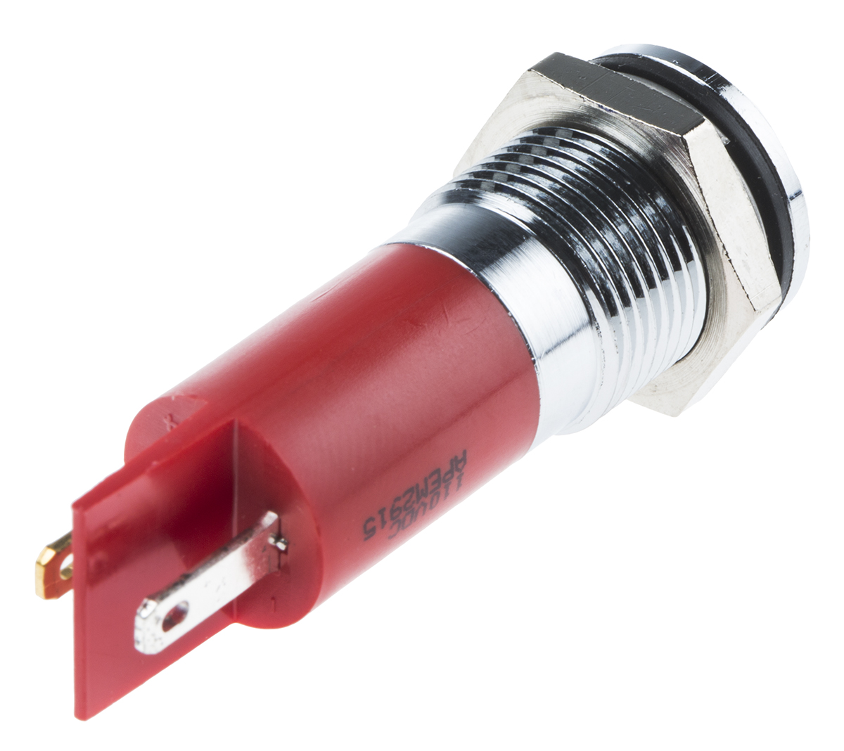 This is Flush Indicator Panel Mount 14mm Mounting Hole Size Red LED Solder Lug Termination 10 mm Lamp Size 110 V dc manufactured by RS Pro. The manufacturer part number is 833-2894. Regarding light output colour, it outputs red light colour. The product has a current rating of 6ma. In addition, It features 14mm of mounting hole size. It is IP rated with ip67. Furthermore, the bezel has a classic chrome colour. Moreover, the product has a nominal 110v dc voltage rating. The given intensity of the product is 10mcd. Its accurate length is 34.1mm. The bezel features a flush style. It is a type of led lamp.