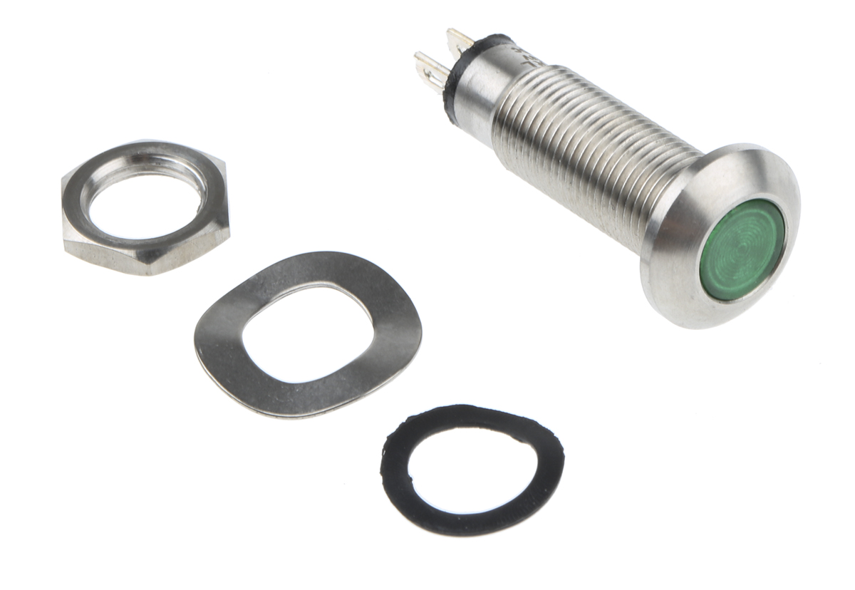 This is Green LED Indicator 12 → 28 V 7 mm Lamp Size 8.1mm Mounting Hole Size manufactured by Marl. The manufacturer part number is 534-532-63. Regarding light output colour, it outputs green light colour. The product has a current rating of 6 → 16ma. In addition, It features 8.1mm of mounting hole size. It is IP rated with ip67. Furthermore, the bezel has a classic black colour. Moreover, the product has a nominal 12 → 28v voltage rating. Its accurate length is 31.9mm. The bezel features a prominent style. The product is designed with a solder tab termination. It is a type of led lamp.