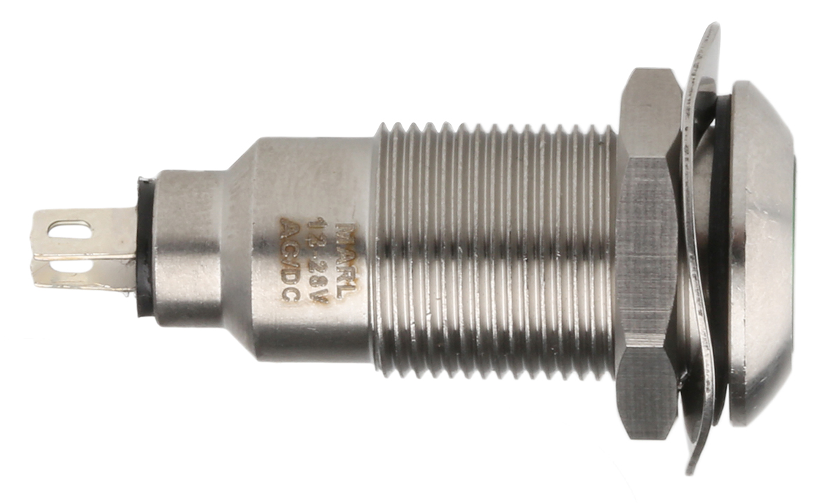 This is Green LED Indicator 12 → 28 V 12.7mm Mounting Hole Size manufactured by Marl. The manufacturer part number is 538-532-63. Regarding light output colour, it outputs green light colour. The product has a current rating of 6 → 16ma. In addition, It features 12.7mm of mounting hole size. It is IP rated with ip67. Furthermore, the bezel has a classic chrome colour. Moreover, the product has a nominal 12 → 28v voltage rating. Its accurate length is 37mm. The product is designed with a solder tab termination. It is a type of led lamp.