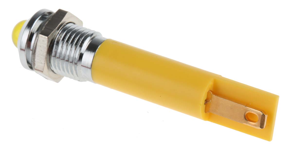 This is Yellow LED Indicator 24 V ac 5 mm Lamp Size 8mm Mounting Hole Size manufactured by RS Pro. The manufacturer part number is 210-585. Regarding light output colour, it outputs yellow light colour. The product has a current rating of 20ma. In addition, It features 8mm of mounting hole size. Moreover, the product has a nominal 24v ac voltage rating. Furthermore, the bezel has a classic chrome colour. The given intensity of the product is 40mcd. Its accurate length is 40mm. The bezel features a prominent style. The product is designed with a solder tab termination. It is a type of led lamp.