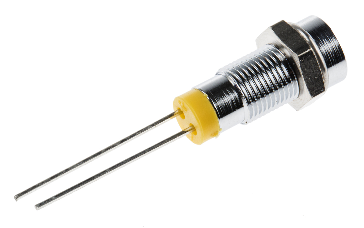 This is Yellow LED Indicator 2 V dc 3 mm Lamp Size 6mm Mounting Hole Size manufactured by RS Pro. The manufacturer part number is 211-825. Regarding light output colour, it outputs yellow light colour. Its lamp is 3 mm in size . In addition, It features 6mm of mounting hole size. The product is available in panel mount configuration. Moreover, the product has a nominal 2v dc voltage rating. Furthermore, the bezel has a classic chrome colour. The given intensity of the product is 30mcd. Its accurate length is 30mm. The bezel features a recessed style. The product is designed with a lead pin termination. The product has a current rating of 20ma. It is a type of led lamp.