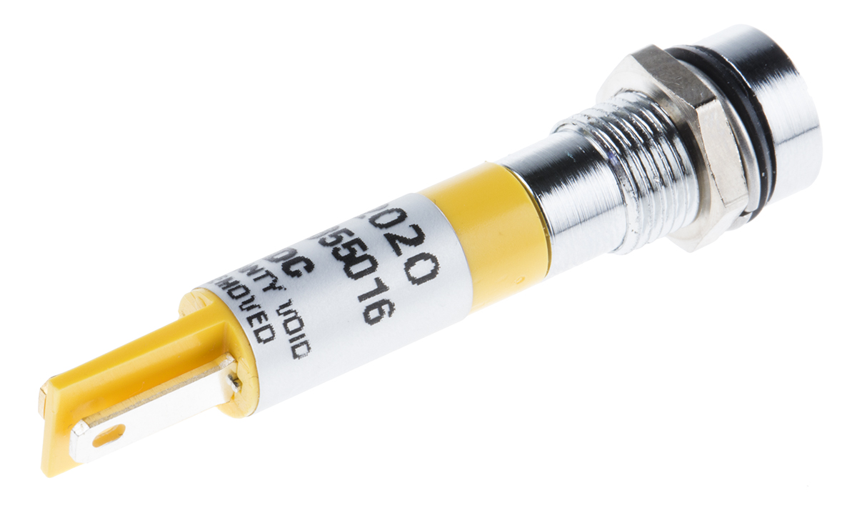 This is Yellow LED Indicator 24 V ac/dc 5 mm Lamp Size 8mm Mounting Hole Size IP67 manufactured by RS Pro. The manufacturer part number is 212-020. Regarding light output colour, it outputs yellow light colour. The product has a current rating of 20ma. In addition, It features 8mm of mounting hole size. It is IP rated with ip67. Furthermore, the bezel has a classic chrome colour. The given intensity of the product is 2000mcd. Its accurate length is 41mm. The bezel features a recessed style. The product is designed with a solder tab termination. It is a type of led lamp.