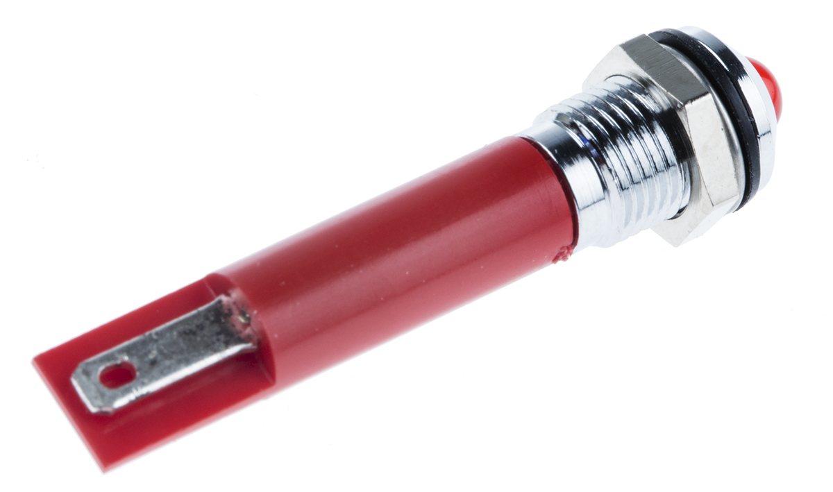 This is Red LED Indicator 24 V ac/dc 5 mm Lamp Size 8mm Mounting Hole Size IP67 manufactured by RS Pro. The manufacturer part number is 212-042. Regarding light output colour, it outputs red light colour. The product has a current rating of 17ma. In addition, It features 8mm of mounting hole size. It is IP rated with ip67. Furthermore, the bezel has a classic chrome colour. Moreover, the product has a nominal 24v dc voltage rating. The given intensity of the product is 6000mcd. Its accurate length is 44mm. The bezel features a prominent style. The product is designed with a solder tab termination. It is a type of led lamp.