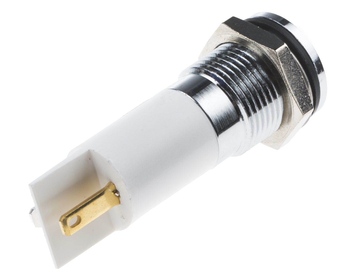 This is White LED Indicator 24 V dc 10 mm Lamp Size 14mm Mounting Hole Size IP67 manufactured by RS Pro. The manufacturer part number is 703-8844. Regarding light output colour, it outputs white light colour. The product has a current rating of 20ma. The product is designed with a solder tab termination. In addition, It features 14mm of mounting hole size. It is IP rated with ip67. Furthermore, the bezel has a classic chrome colour. Moreover, the product has a nominal 24v dc voltage rating. Its accurate length is 35.6mm. The given intensity of the product is 20mcd. The bezel features a flush style. It is a type of led lamp.